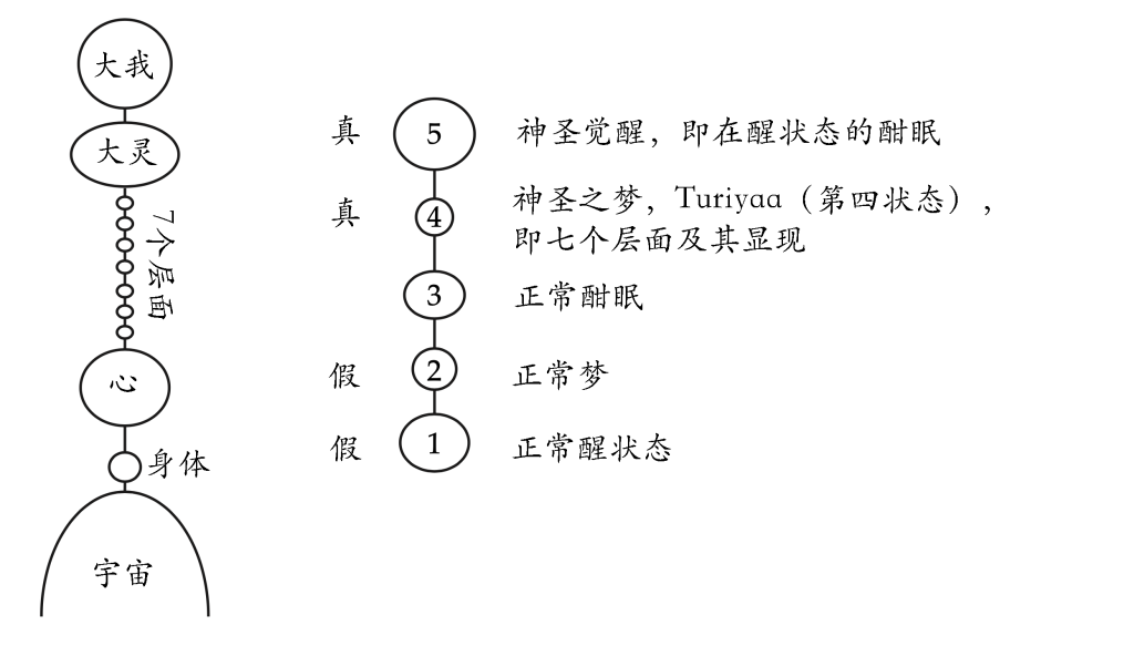 总之,如果普通心在醒状态脱离(背离、忘却)身体和世界(放弃用身体享受体验世界)并且专注于神圣,就可以说已经开始从普通酣眠(3)向神性酣眠(5)前进。在从3向5(专注)前进时,必须经过神圣梦状态(七个层面),直到抵达“醒酣眠”(5)——在此无梦,只有酣眠=光。